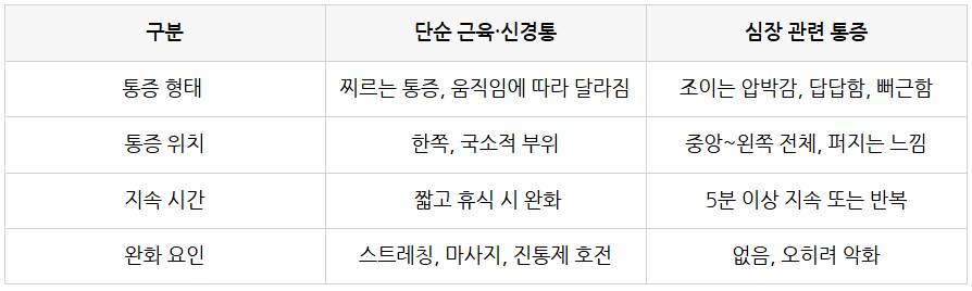 움직임·자세에 따라 달라지면 근육통, 휴식 중에도 반복되고 숨참·식은땀·방사통이 있으면 심장통일 가능성이 높습니다.