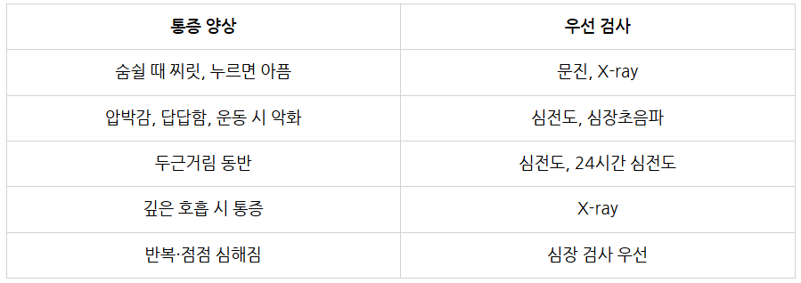 이 글은 병원을 바로 권하는 글이 아니라, 왼쪽 가슴통증의 원인별로 어떤 검사가 필요한지 판단 기준을 정리해주는 글입니다.