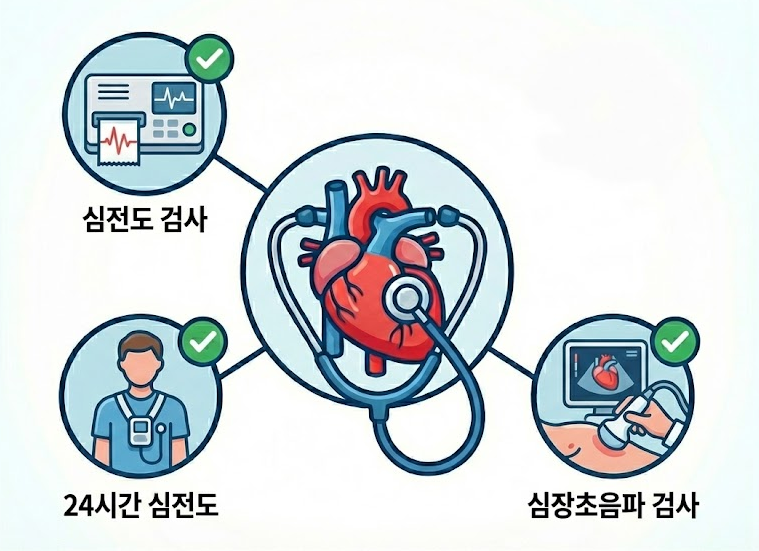 심전도 검사: 현재 심장 리듬 확인 24시간 심전도 검사: 일상 중 박동 변화 기록 심장초음파 검사: 심장 구조와 기능 평가
