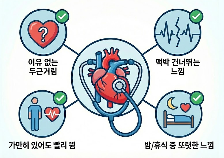 이유 없이 심장이 두근거리는 느낌 맥박이 한 박자 건너뛰는 듯한 느낌 가만히 있어도 심장이 빨리 뛰는 느낌 밤이나 휴식 중에 더 또렷하게 느껴지는 두근거림