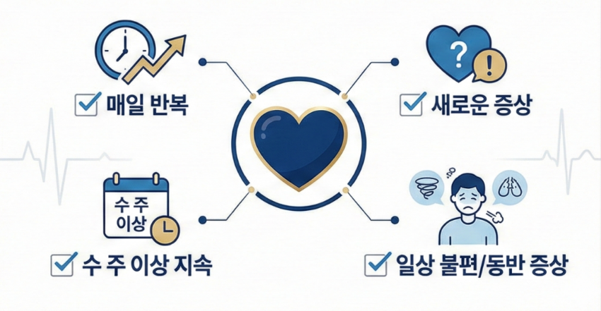 이유 없이 심장이 두근거리는 느낌이 반복될 때 맥박이 불규칙하거나 한 박자 건너뛰는 느낌이 들 때 휴식 중이나 잠자리에 누웠을 때 증상이 나타날 때 두근거림과 함께 어지럼, 숨 가쁨이 동반될 때 증상이 점점 잦아지거나 양상이 달라질 때