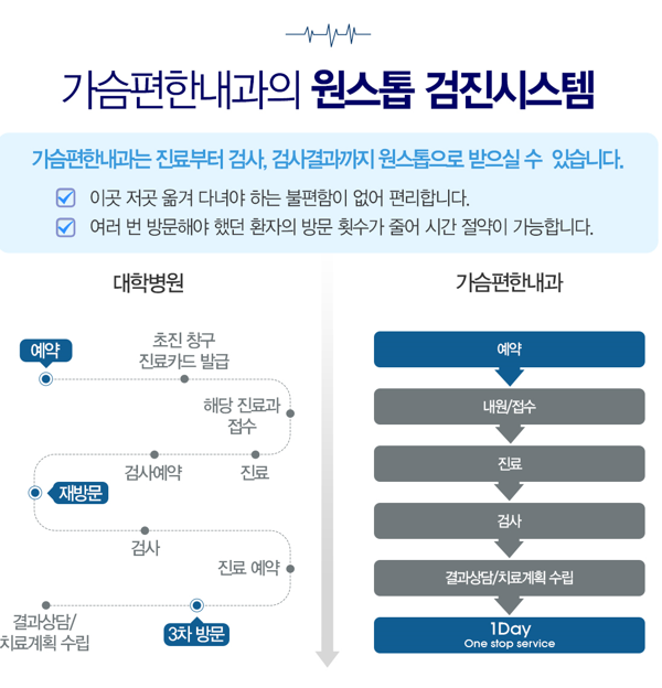 대학병원의 복잡한 대기 과정 없이 내원 당일 진료부터 검사, 결과 상담까지 한 번에 끝내는 원스톱 시스템을 운영합니다.