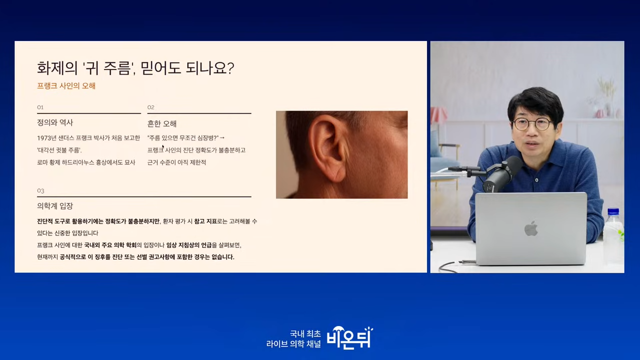 요즘 심장질환의 사인이라고 하고 있는 '대각선 귓볼주름'에 대해 관심이 높아지고 있는데요. 이 귀 주름을 '프랭크 사인'이라고 합니다. 결론적으로 말씀드리면 진단적으로 활용하기에는 정확도가 불충분하지만, 참고 지표로는 고려해 볼 수 있습니다. 공식적으로 이를 심혈관 질환의 징후라고 보기는 어렵습니다.