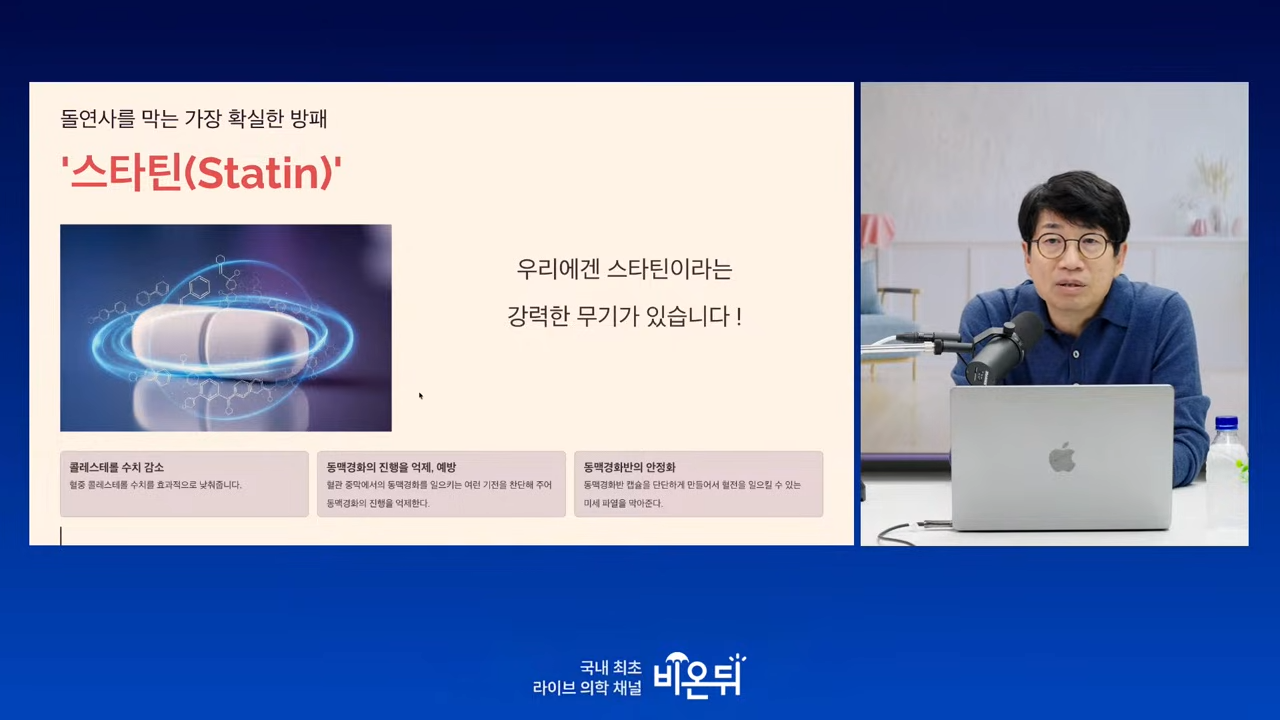 스타틴(statin)은 아래와 같은 효과로 돌연사를 막을 수 있는 확실한 방패로 여겨지고 있습니다. - 콜레스테롤 수치 감소: 혈중 콜레스테롤 수치를 효과적으로 낮춰줍니다. - 동백경화의 진행을 억제, 예방: 혈관 중막에서의 동맥경화를 일으키는 여러 기전을 차단하여 동맥경화의 진행을 억제합니다. - 동맥경화반의 안정화: 동맥경화반 캡슐을 단단하게 만들어서 혈전을 일으킬 수 있는 미세 파열을 막아줍니다. 젊을 때 적극적으로 관리해야 합니다